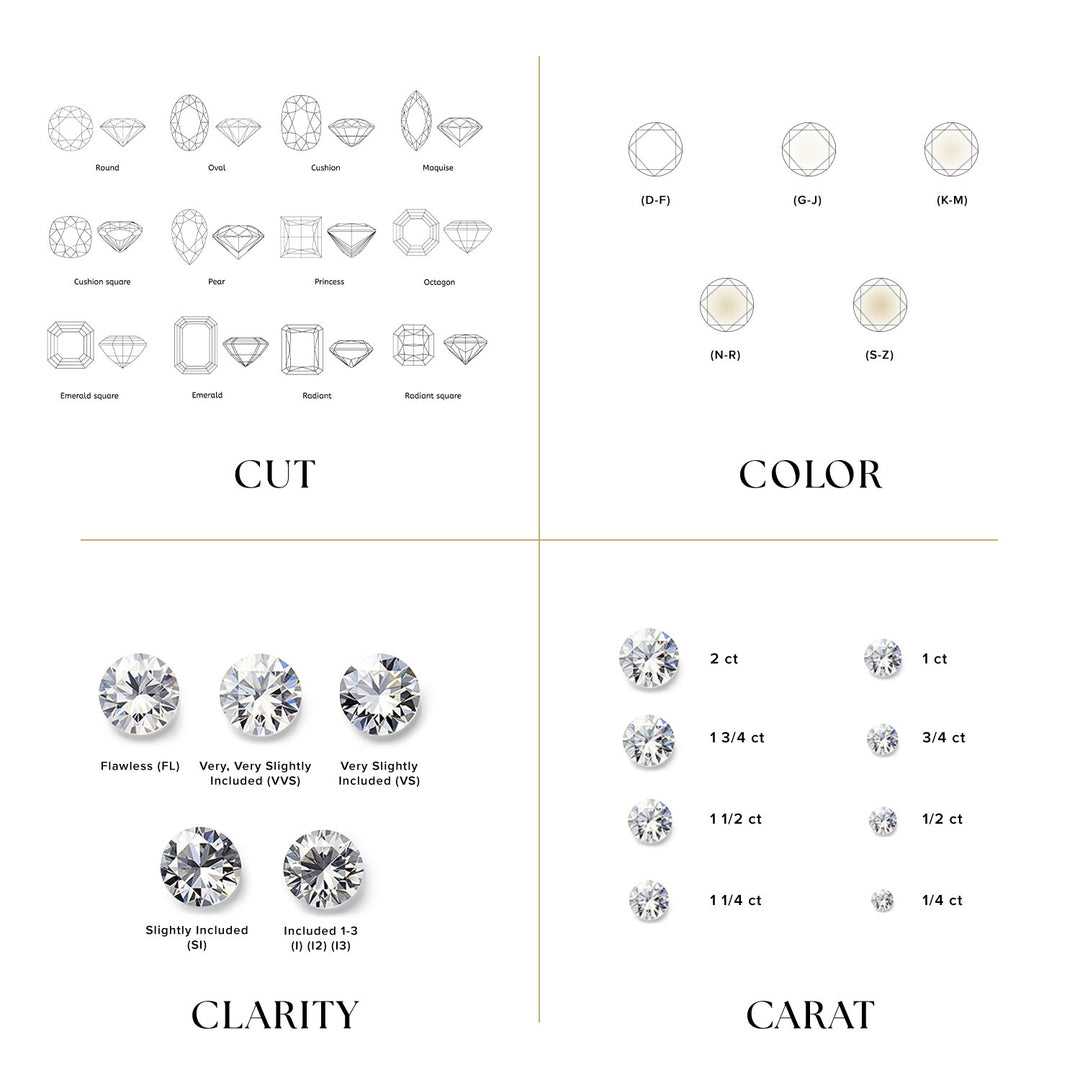 The 4 C’s are cut, color, clarity, and carat. The cut is characterized by the angles that shape the diamond, which determines how much it reflects. It affects the diamond’s sparkle, so choosing the cut will have an overall effect on the ring’s shimmer. Color, or lack of color, tells you how rare the diamond is. The tones you see inside the diamond tell you its “color,” whether yellow, gray, or colorless. A diamond with less color has more value. Clarity refers to imperfections found on the diamond. At a microscopic level, you can see if there are any flaws in the diamond. The fewer flaws, the more rare. Finally, the carat tells you how much the diamond weighs. Depending on a diamond’s carat, it can appear larger or smaller on the ring finger.