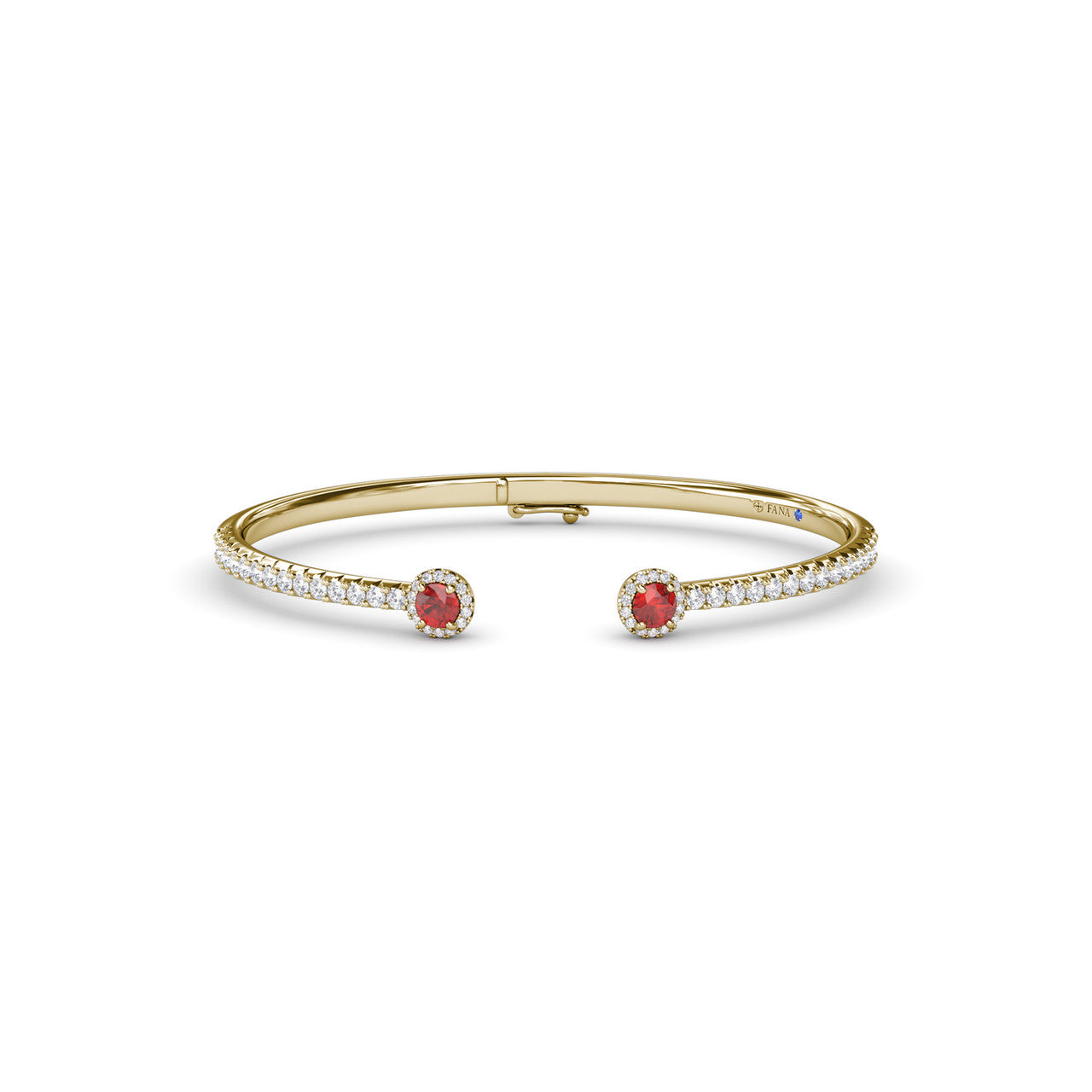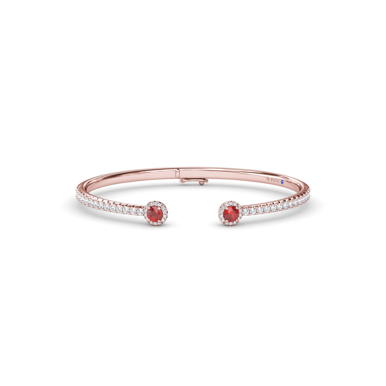 Enhance your style with this halo ruby and diamond bangle. This bangle comes in a variety of material types like 14k white gold, yellow gold, rose gold and can be customized. Classic Fana gemstone bangles are perfect for that special woman in your life.