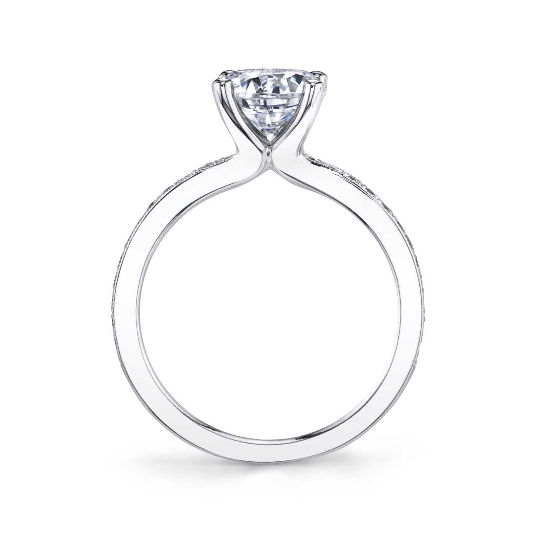 This classic solitaire engagement ring features a 1.5 carat round brilliant diamond set in a diamond and milgrain detailed shank with a total of 0.21 carats.