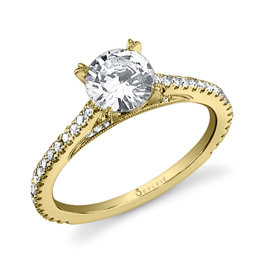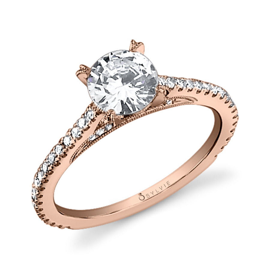 This classic white gold solitaire engagement ring features a 1 carat round brilliant center with a total of 0.31 carats on the diamond shank.