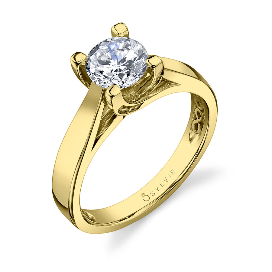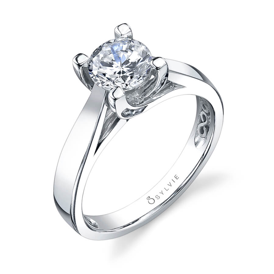 This stunning classic solitaire engagement ring features a 1 carat round brilliant center with a total of 0.11 carats of round diamonds on the prongs of the head and shiny high polished shank.