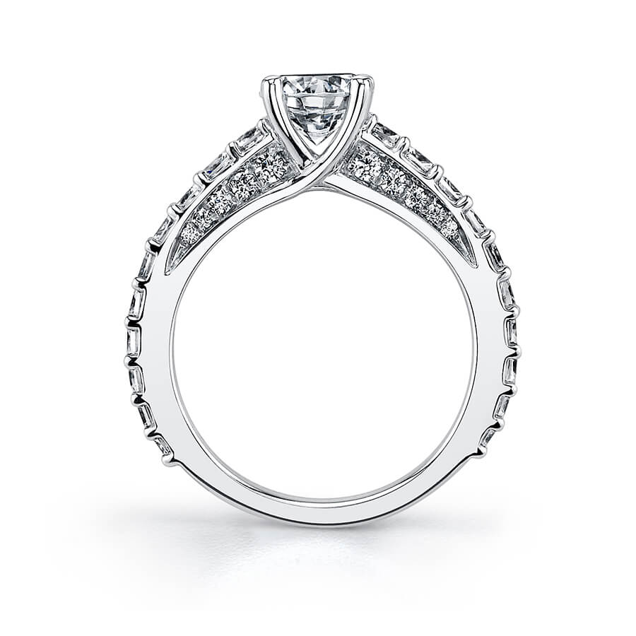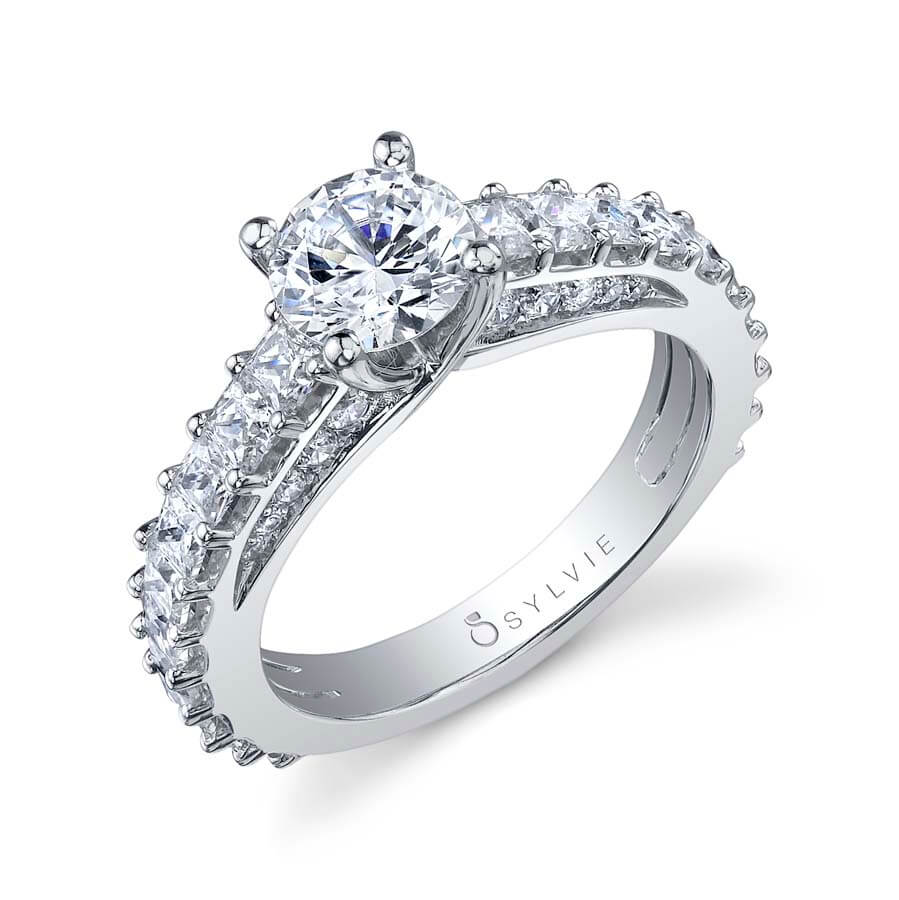 This bold and stunning prong set solitaire engagement ring features a 1 carat round brilliant center with a total weight of 1.54 carats and large glimmering princess cut diamonds cascading down the shank.