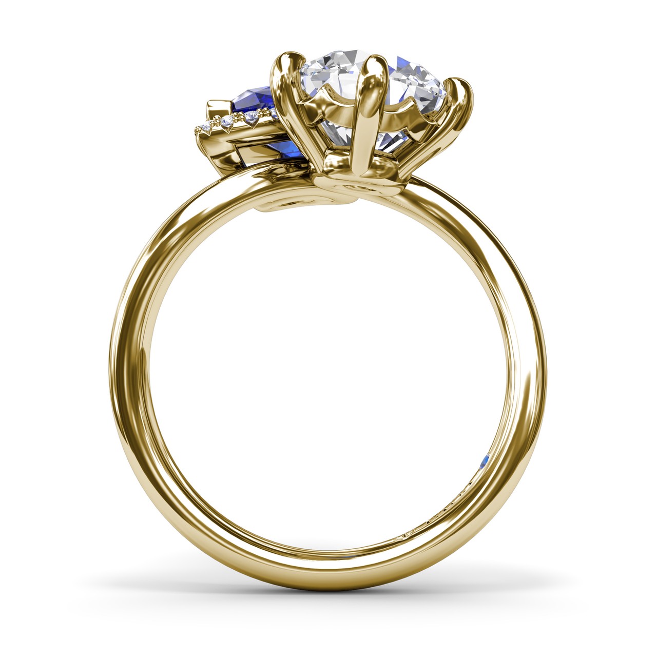 This showstopping Toi et Moi engagement ring features a dazzling round diamond set in a six-prong setting, complimented by a regal pear-shaped sapphire with a halo of diamonds encircling the pear for added sparkle. This design can be customized based on stone shape and metal preference.