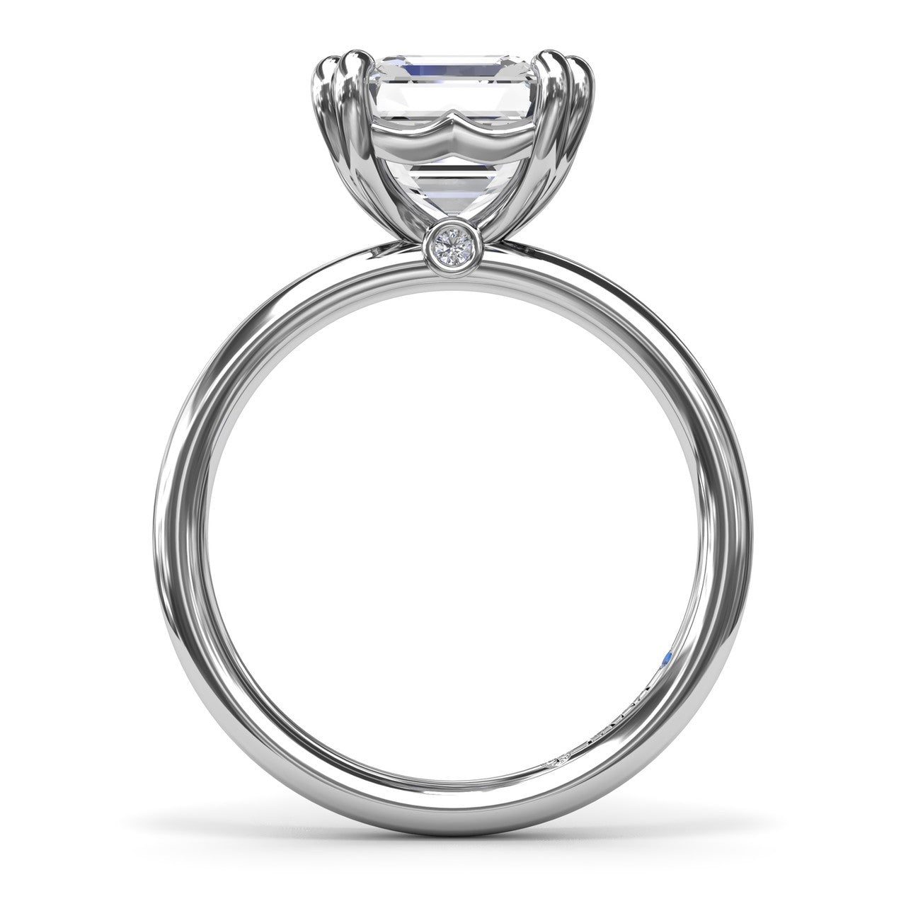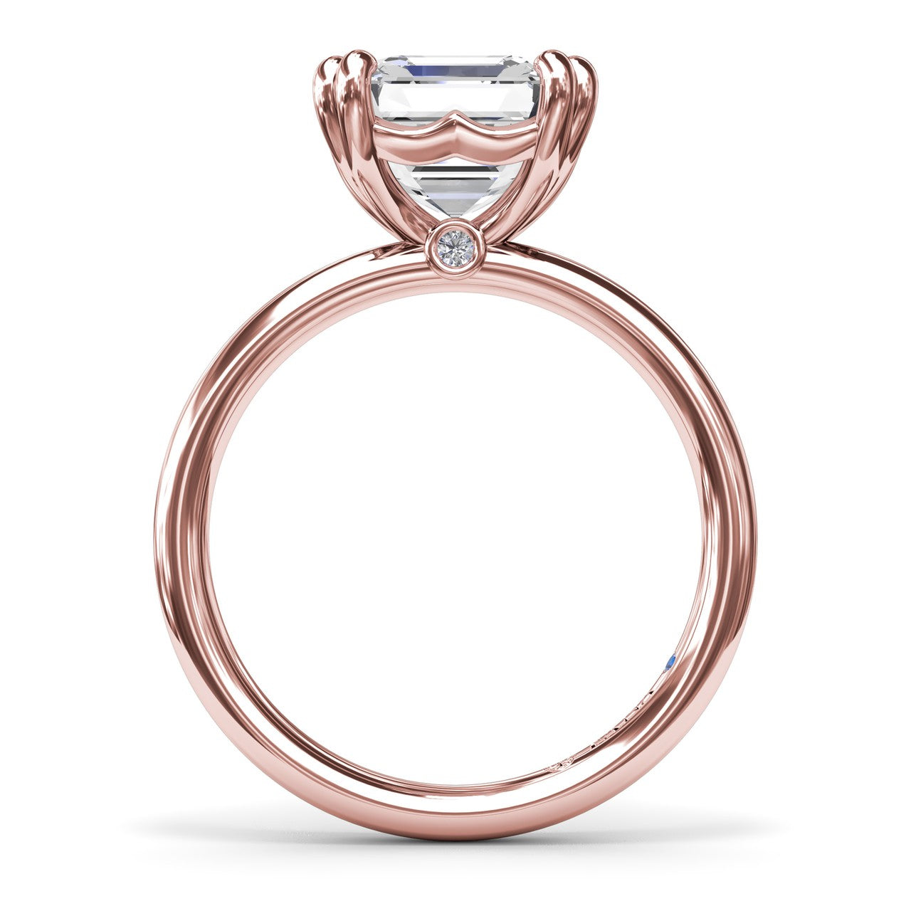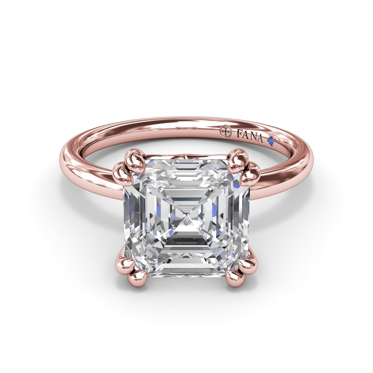 An elegant asscher cut diamond is securely set in a double prong setting, enhancing both security and elegance. The design is also graced with a peek-a-boo diamond, adding subtle sparkle. This style can be customized based on stone shape and metal preference.