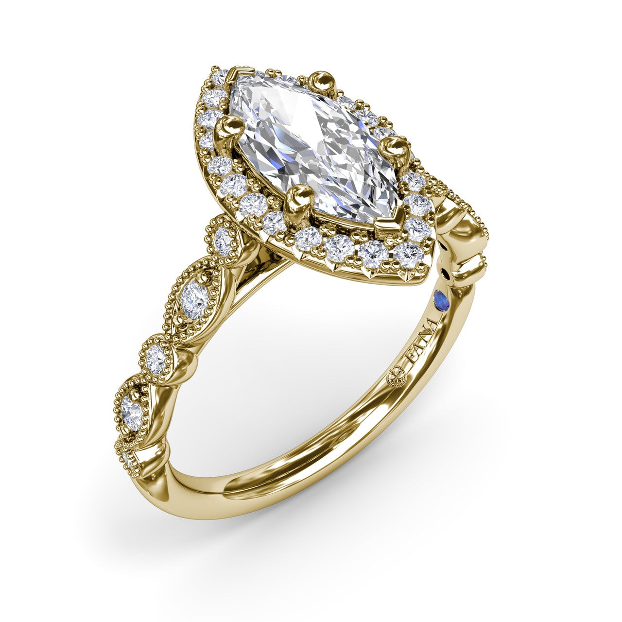 This timeless design has both classic appeal and a contemporary look with an extra touch of detailing and a glimmering band. This detailed engagement ring can be special ordered in any finger size, in Platinum, 18KT & 14KT gold and can be customized for any shape and size centerstone.