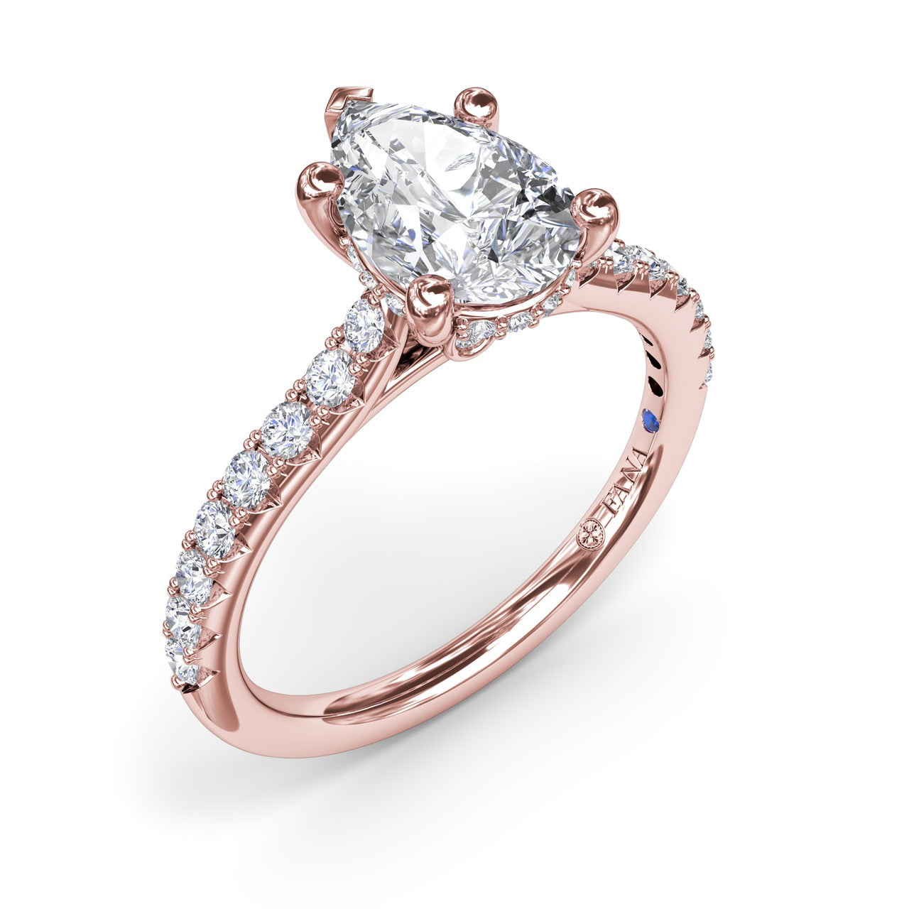 Classic and chic, this engagement ring features a pave diamond shank and a hidden halo of diamonds embracing the center. This engagement ring can be special ordered in any finger size, in Platinum, 18KT & 14KT gold and can be customized for any shape and size centerstone.