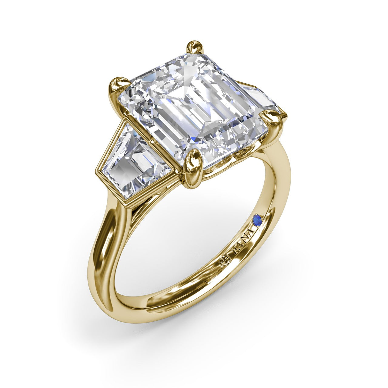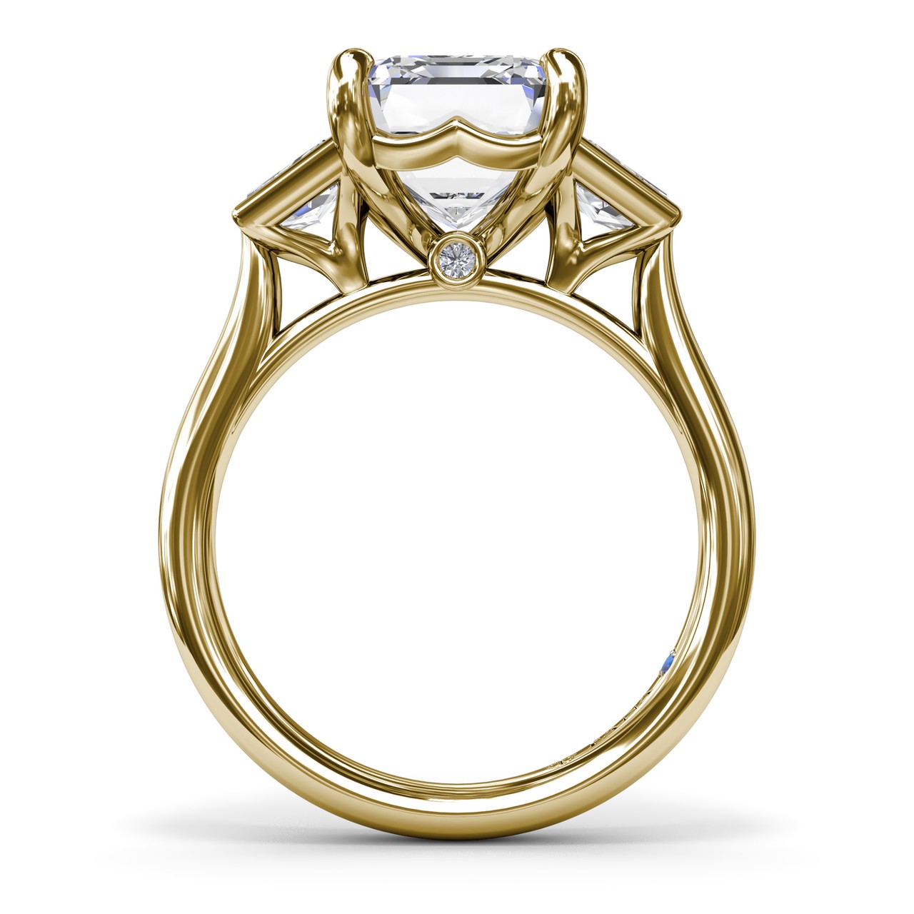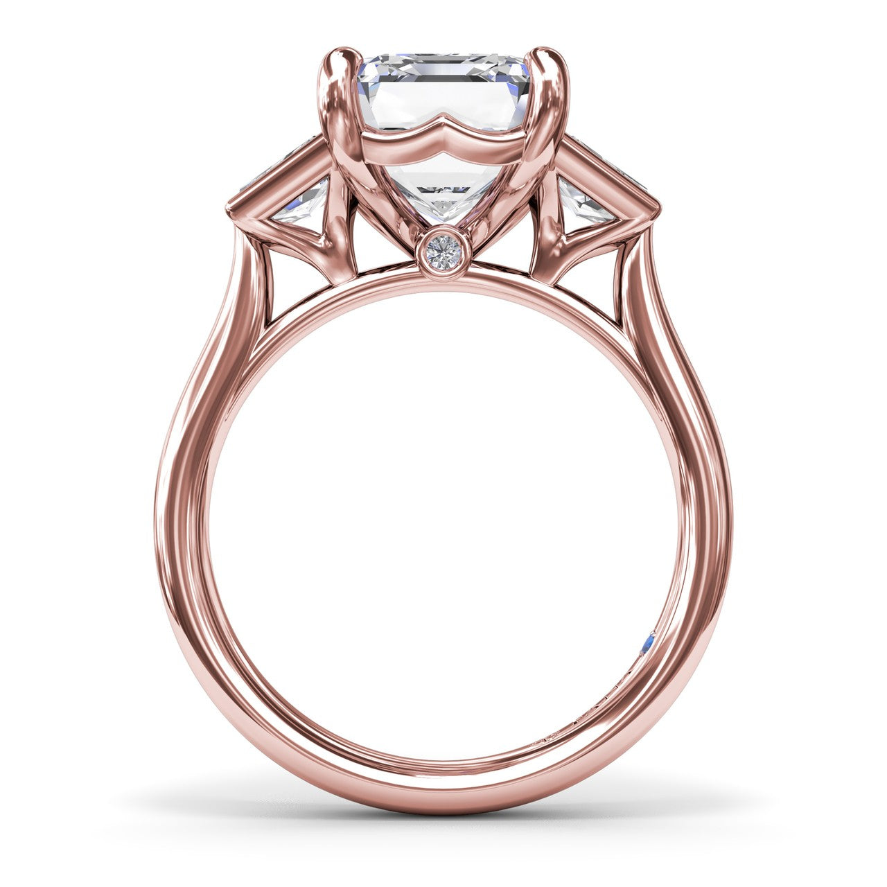 This bold three-stone engagement ring features an emerald cut center diamond complimented by two trapezoid diamonds on each side. The design is enhanced by a cathedral setting and a hidden peek-a-boo diamond, adding extra sparkle to this striking style. This style can be customized based on stone shape and metal preference.