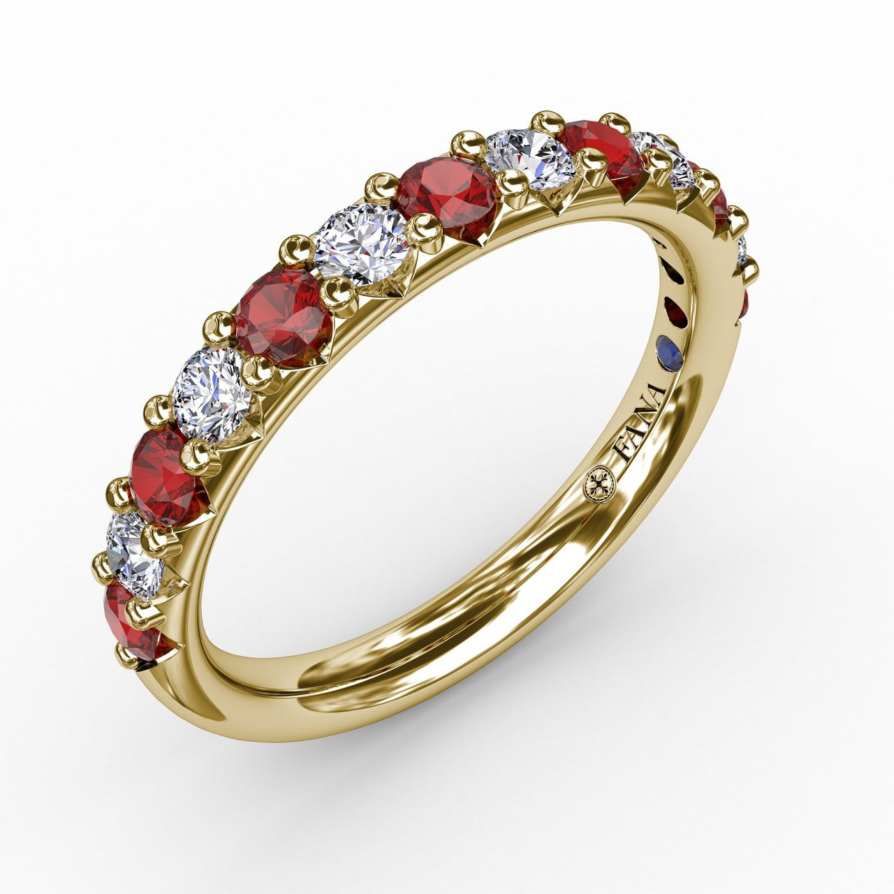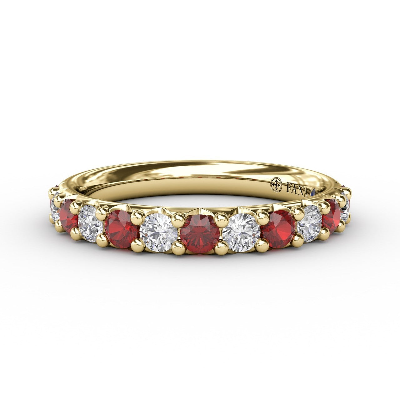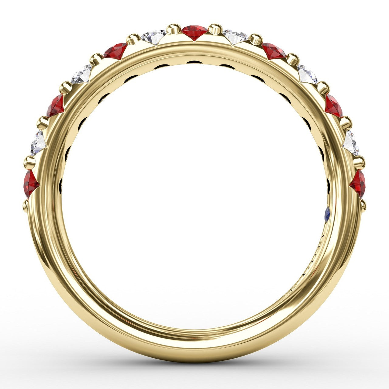 Our shared prong anniversary band offers a modern aesthetic with a series of deep cut v's in the profile to allow the brilliance of each hand set diamond and ruby to be on full display. This anniversary band can be special ordered in any finger size, in Platinum, 18KT & 14KT gold and can be customized for any shape and size centerstone.