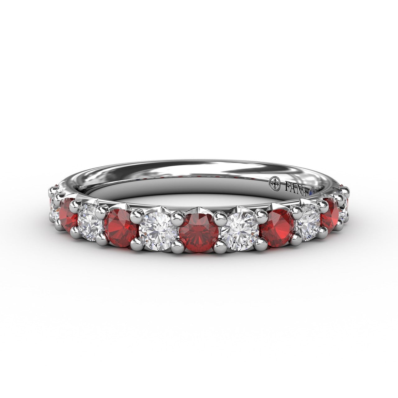 Our shared prong anniversary band offers a modern aesthetic with a series of deep cut v's in the profile to allow the brilliance of each hand set diamond and ruby to be on full display. This anniversary band can be special ordered in any finger size, in Platinum, 18KT & 14KT gold and can be customized for any shape and size centerstone.