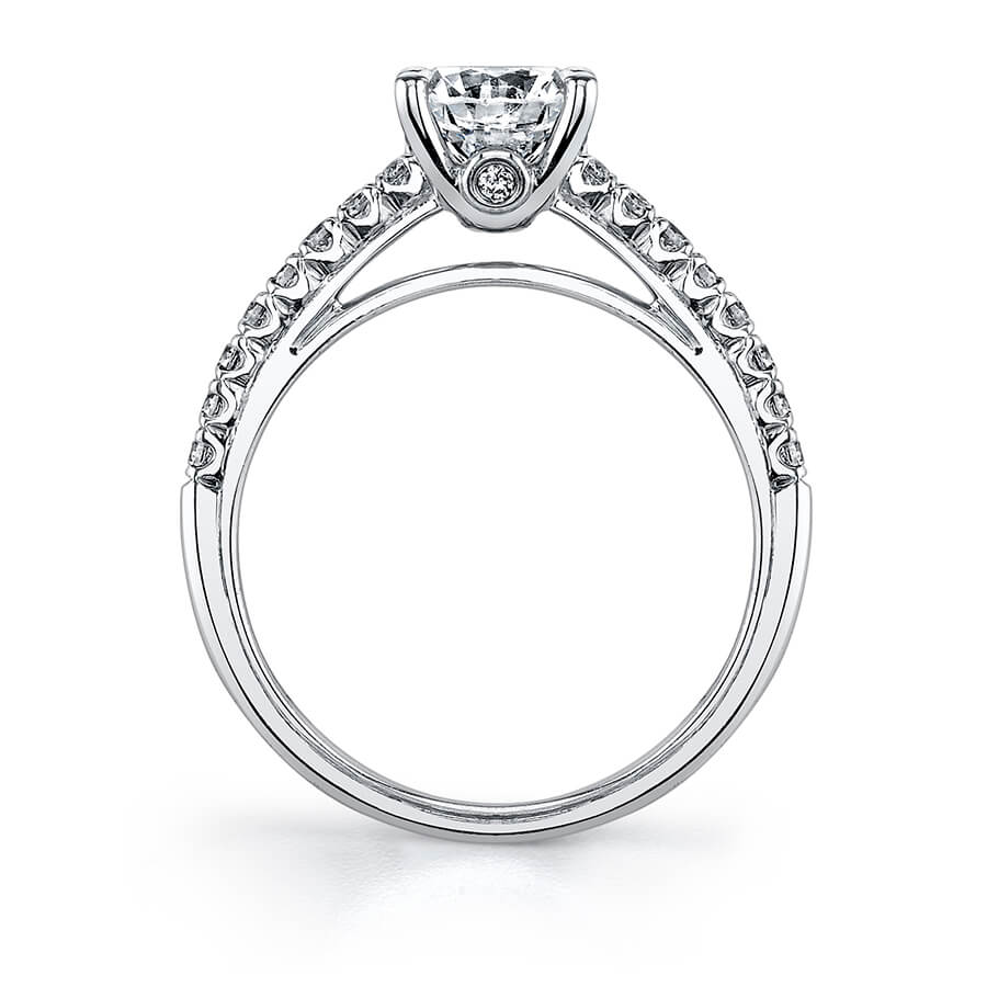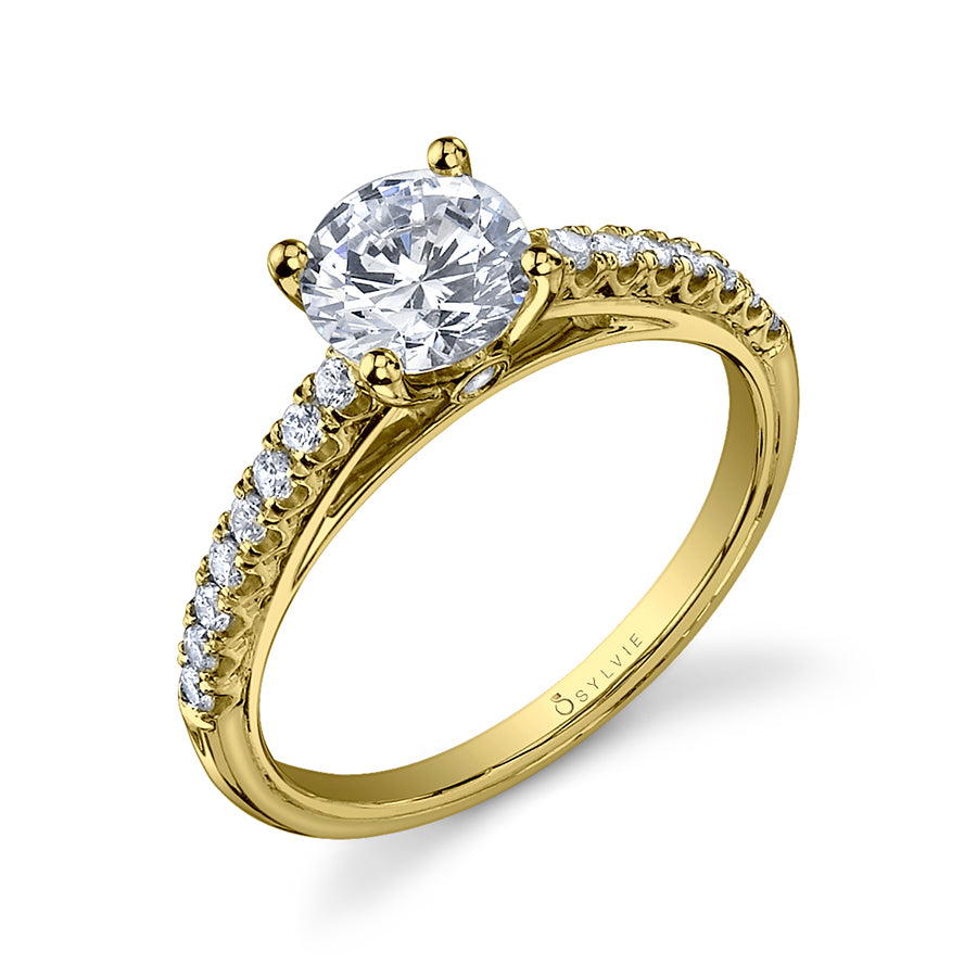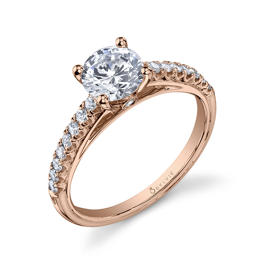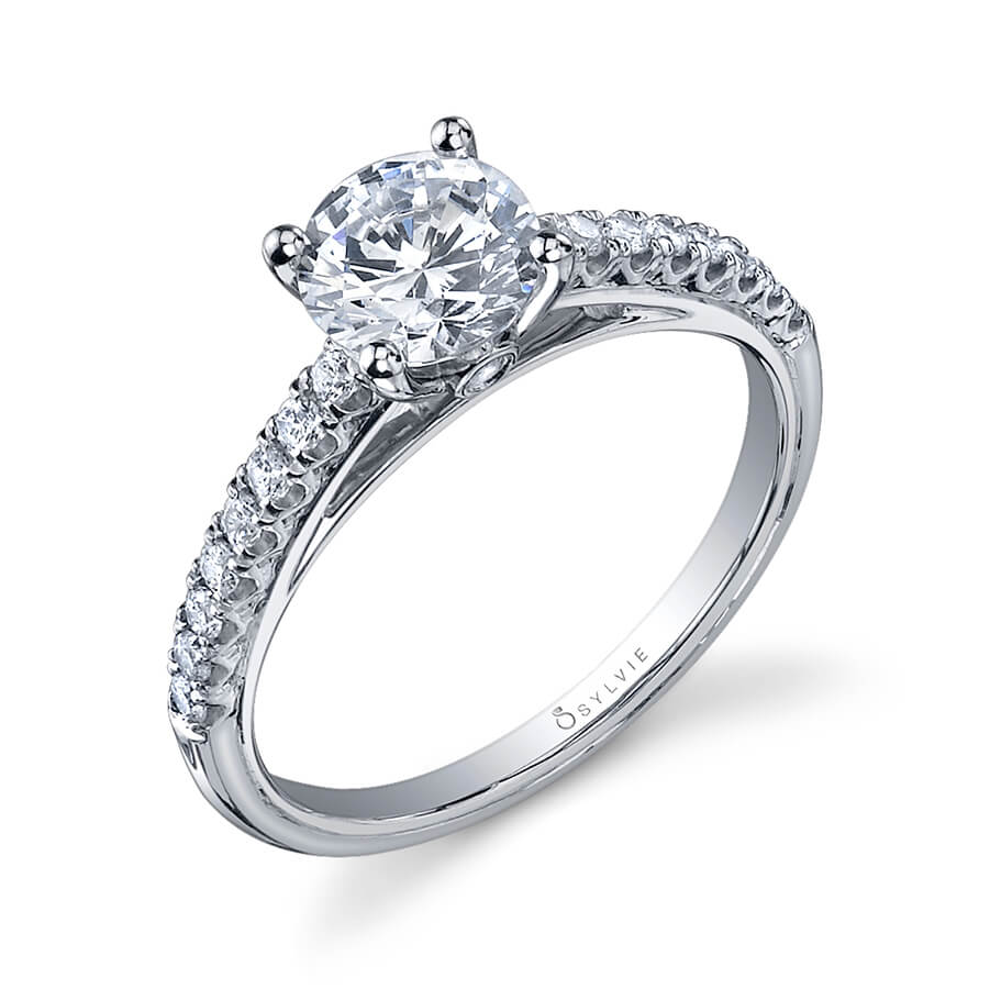 This classic solitaire engagement ring features a 1.00 carat round brilliant center with a total of 0.23 carats down the sides of the shank for a classic design that is always in style.