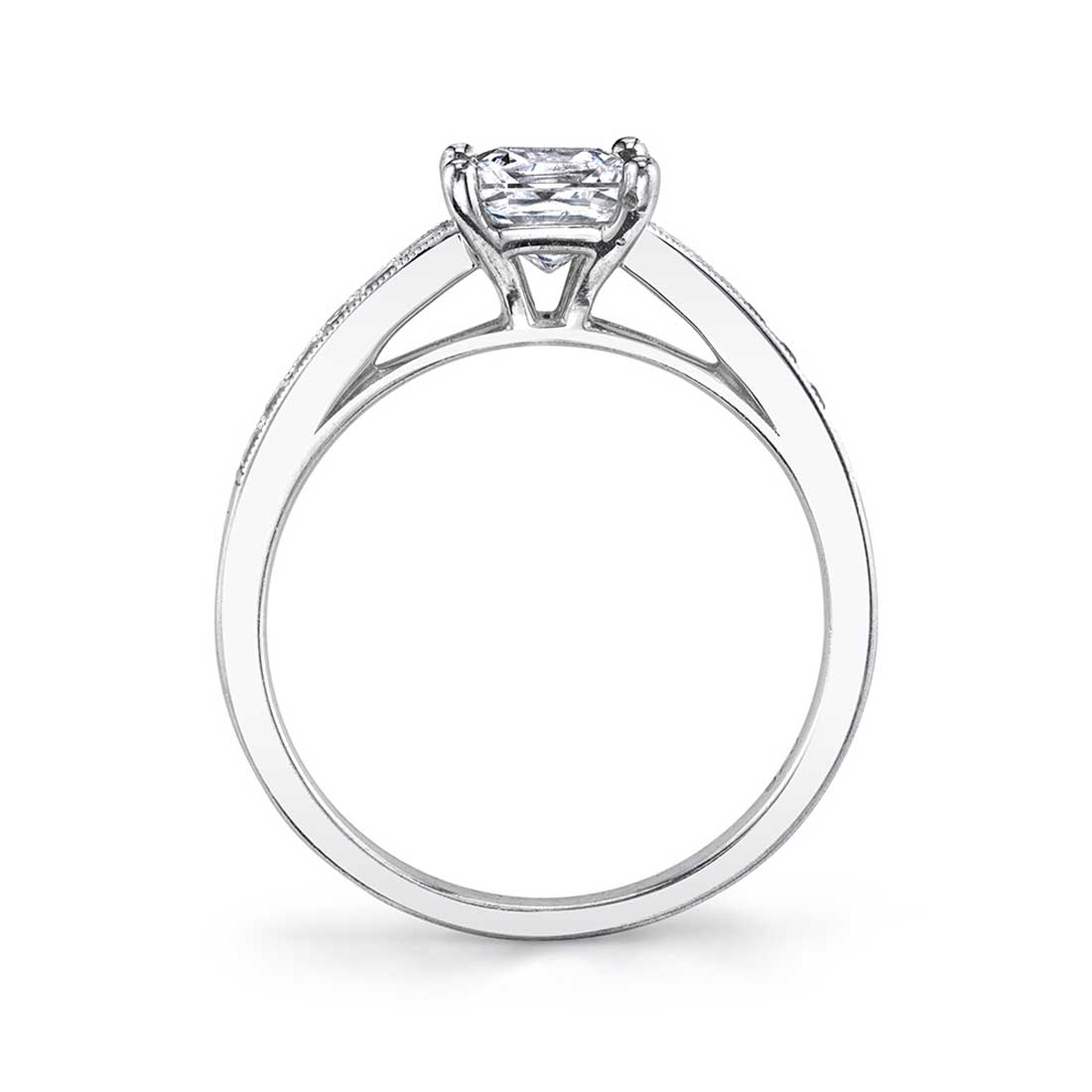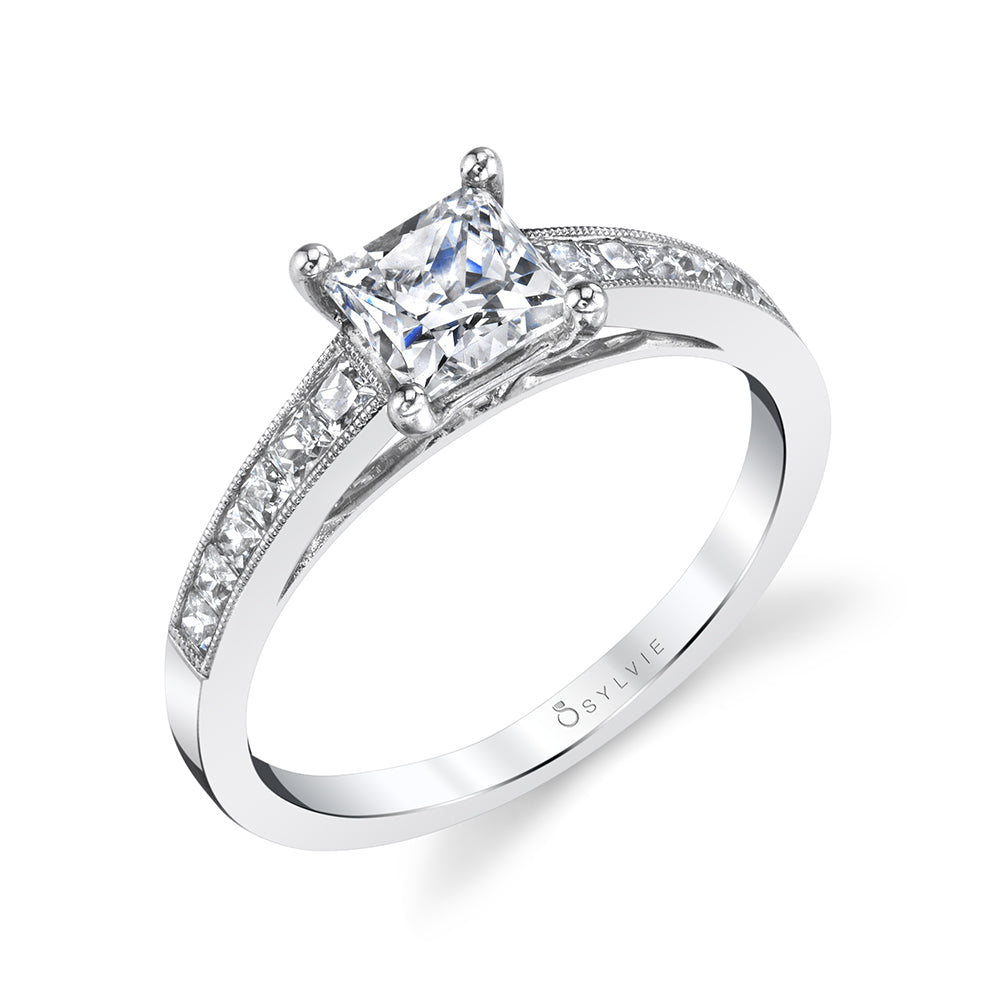 This petite princess cut solitaire engagement ring features a 0.75 carat princess cut diamond center with milgrain accents and princess diamonds on the shank with a total of 0.32 carats.