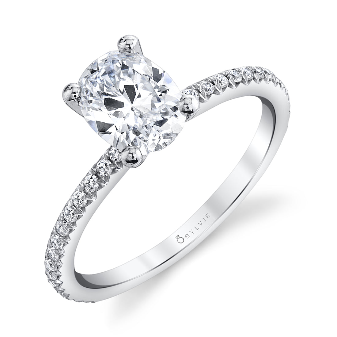 A fan favorite, this stunning solitaire engagement ring features a dazzling 1 carat oval diamond in a prong setting and placed upon a shank accented with a total weight of 0.21 carats of cascading pave diamonds.